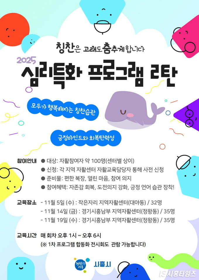 [시흥타임즈] 시흥시(시장 임병택)는 자활참여자의 정서적 역량 강화를 위해 지난 11월 5일 ‘2025년 자활참여자 심리특화 프로그램 2탄’을 대야동과 정왕동에서 진행했다. 이번 프로그램은 센터별 찾아가는 워크숍 방식으로 운영돼, 참여자들이 일상에서도 쉽게 참여하고 스스로 성장할 기회를 제공한다.이번 프로그램은 5일을 시작으로 14일, 19일까지 총 3회에 걸쳐 진행되며, 회차당 약 34명의 자활참여자가 함께한다. 교육은 대야동과 정왕동에 있는 사회적협동조합 작은자리지역자활센터와 경기시흥남부 지역자활센터 교육장에서 각각 추진된다.