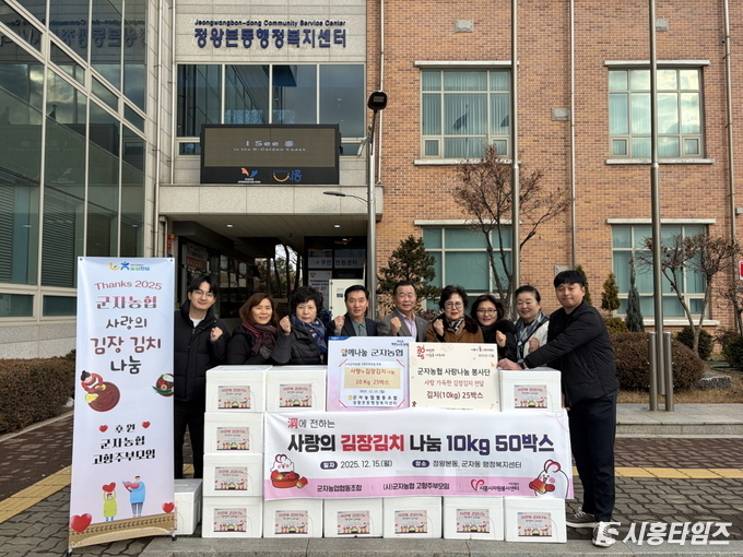 [시흥타임즈] 시흥시 정왕본동 행정복지센터(동장 박래천)는 지난 12월 15일 군자농협 사랑나눔봉사단으로부터 다문화가정 및 취약계층을 위한 김장 김치 10kg 25상자를 기탁받았다.군자농협 사랑나눔봉사단은 지난 2022년부터 매년 정왕본동의 어려운 이웃을 위해 김장김치를 기탁하고 있으며, 이번 ‘사랑의 김장 나누기’ 행사는 군자농협과 봉사단 회원들이 함께 뜻을 모아 준비해 더욱 의미를 더했다.