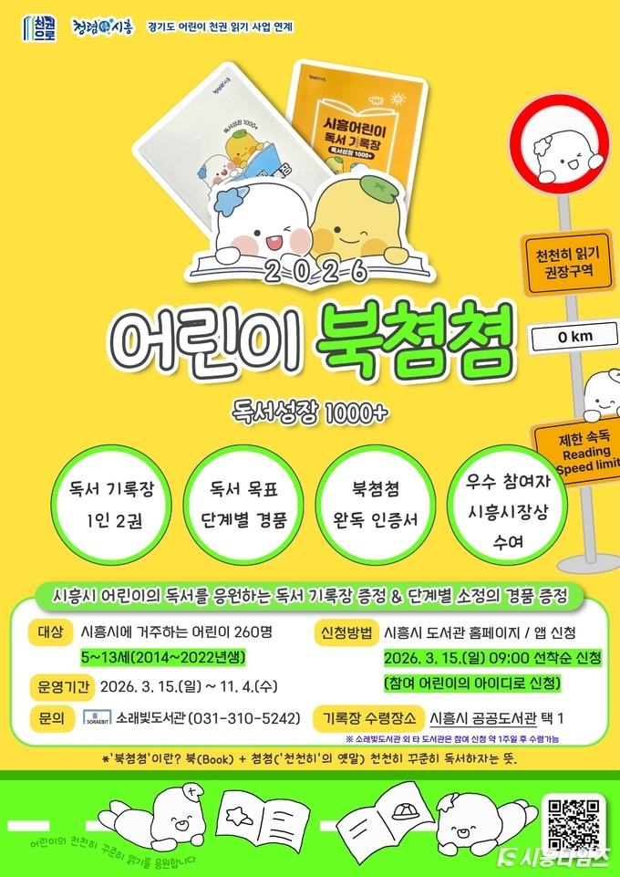 [시흥타임즈] 시흥시 소래빛도서관은 오는 3월 15일부터 관내 5~13세 어린이 260명을 대상으로 독서 기록장을 배부하고, 우수 참여자 8명에게 시흥시장상을 수여하는 독서사업 ‘2026 어린이 북쳠쳠 독서성장 1000+’를 운영한다.‘2026 어린이 북쳠쳠 독서성장 1000+’(이하, 북쳠쳠)은 어린이들이 천천히 꾸준히 책을 읽는 습관을 기를 수 있도록 지원하고자 기획된 사업이다. ‘북쳠쳠’은 ‘북(책)’과 ‘쳠쳠(‘천천히’의 옛말)’이 합쳐진 이름으로 천천히 꾸준히 독서하자는 뜻을 담고 있다. ‘독서성장 1000+’는 경기도의 ‘어린이 천권 읽기’ 사업과 연계해 추진된다는 의미다.