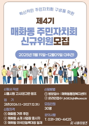 [시흥타임즈] 시흥시 매화동 행정복지센터(동장 김기세)는 12월 9일까지 ‘제4기 매화동 주민자치회’ 신규위원 30명을 공개 모집한다. 신청은 매화동 행정복지센터 방문 또는 전자우편을 통해 가능하다. 매화동 주민자치회는 지역의 다양한 현안에 대해 주민 스스로 자치계획을 수립하고, 주민총회를 통해 실행 방향을 결정하는 주민대표기구다. 제3기 매화동 주민자치회의 임기(2024.01.01.~2025.12.31.)가 만료됨에 따라 「시흥시 주민자치회 및 주민자치센터 설치·운영에 관한 조례」에 기반한 매화동 발전의 혁신적인 마인드를 가진 제4기 신규위원을 선발하며 위원 임기는 2년이고 중도 해촉이 가능하다. 신청 자격요건은 ▲매화동에 주민등록이 돼 있는 사람 ▲매화동에 사업장 주소를 두고 있는 사업장에 종사하는 사람 ▲매화동에 소재한 학교, 기관, 단체 등에 속한 사람 ▲영주의 체류자격을 갖춘 외국인으로서 매화동의 외국인등록대장에 등재된 사람이며, 타 동 주민자치회 위원이나 매화동 관계단체 소속 주민은 지원할 수 없다. 선발된 주민자치회 위원들은 매화동의 발전 방향을 논의하고 자치계획을 수립·집행하는 등 실질적인 지역 자치 권한을 갖게 되며, 주민 의견 수렴, 자치사