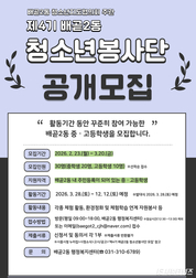 [시흥타임즈] 시흥시 배곧2동 청소년지도협의회는 자원봉사와 다양한 체험활동에 참여할 제4기 배곧2동 청소년봉사단원을 모집한다. 배곧2동 청소년지도협의회는 지역 청소년이 자원봉사와 체험활동을 통해 의미 있는 시간을 보내고, 지역사회 구성원으로 성장할 수 있도록 지원하기 위해 2023년부터 매년 청소년봉사단을 운영해 왔다. 모집 기간은 3월 20일까지다. 배곧2동에 주민등록이 돼 있는 중고등학생 가운데 활동기간에 꾸준한 참여가 가능한 학생이면 지원할 수 있다. 모집 인원은 중학생 20명, 고등학생 10명 등 총 30명이다. 제4기 청소년봉사단은 선착순으로 선발하며, 3월 28일부터 12월 12일까지 매월 1~2회 활동하게 된다. 주요 활동은 각종 체험 프로그램, 환경정화 및 체험학습 연계 자원봉사, 배곧2동 축제와 행사 참여 등이다. 표지언 배곧2동 청소년지도협의회장은 “청소년들이 건강한 환경 속에서 꿈과 가능성을 펼칠 수 있도록 돕는 것이 중요하다”라며 “봉사단 활동을 통해 안전하고 행복하게 성장할 수 있는 기반을 마련하겠다”라고 말했다. 이어 “적극적으로 참여할 중고등학생들의 많은 관심과 신청을 바란다”라고 덧붙였다. 김우회 배곧2동장은 “이번 봉사단 모집이